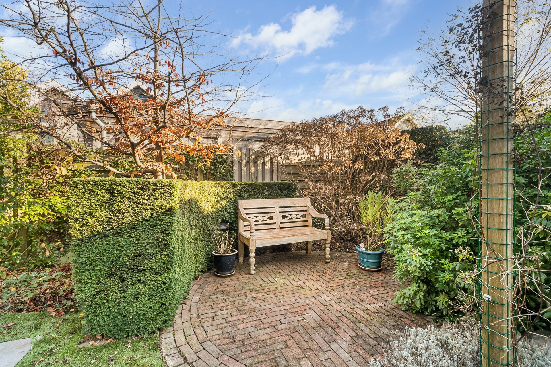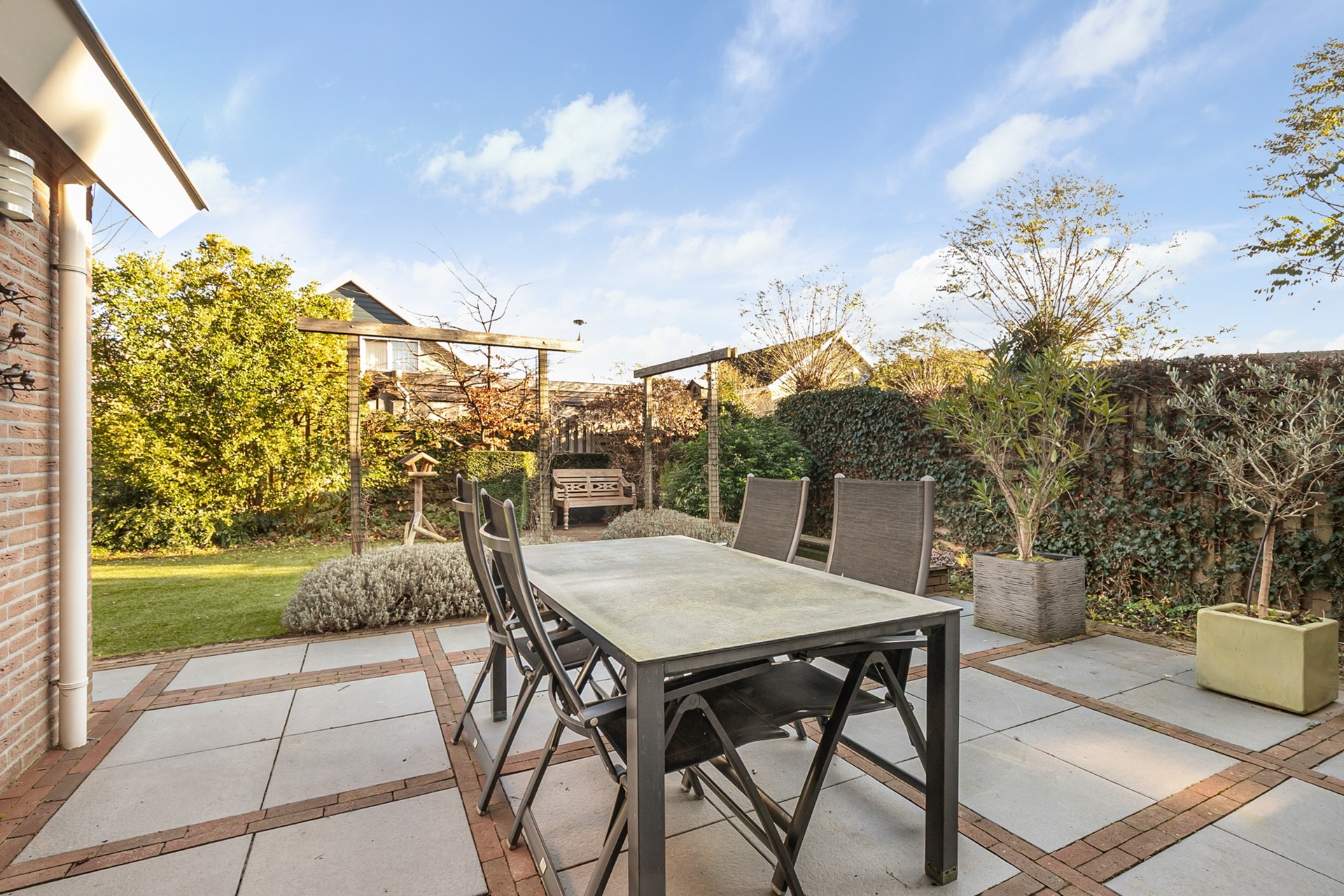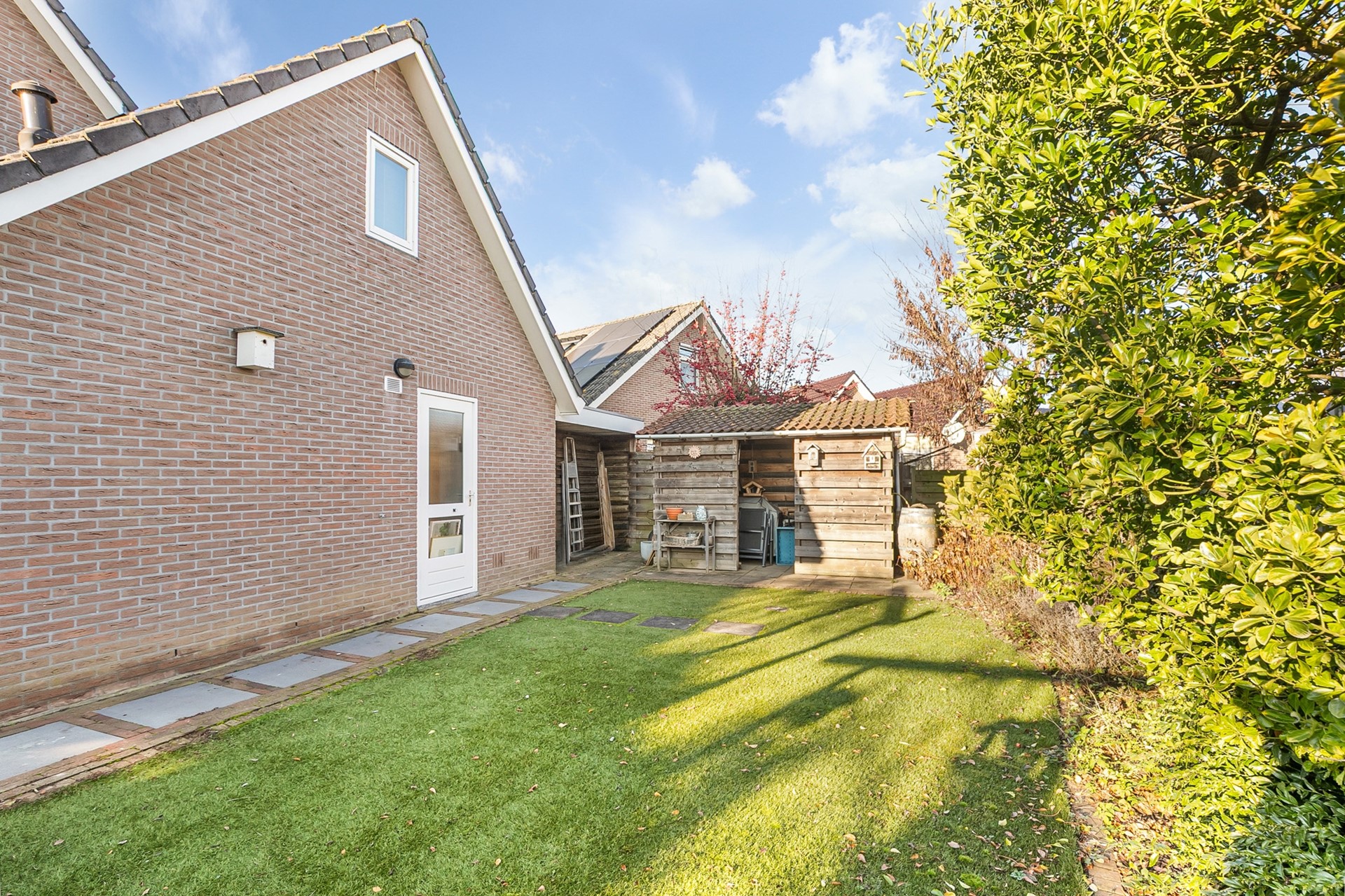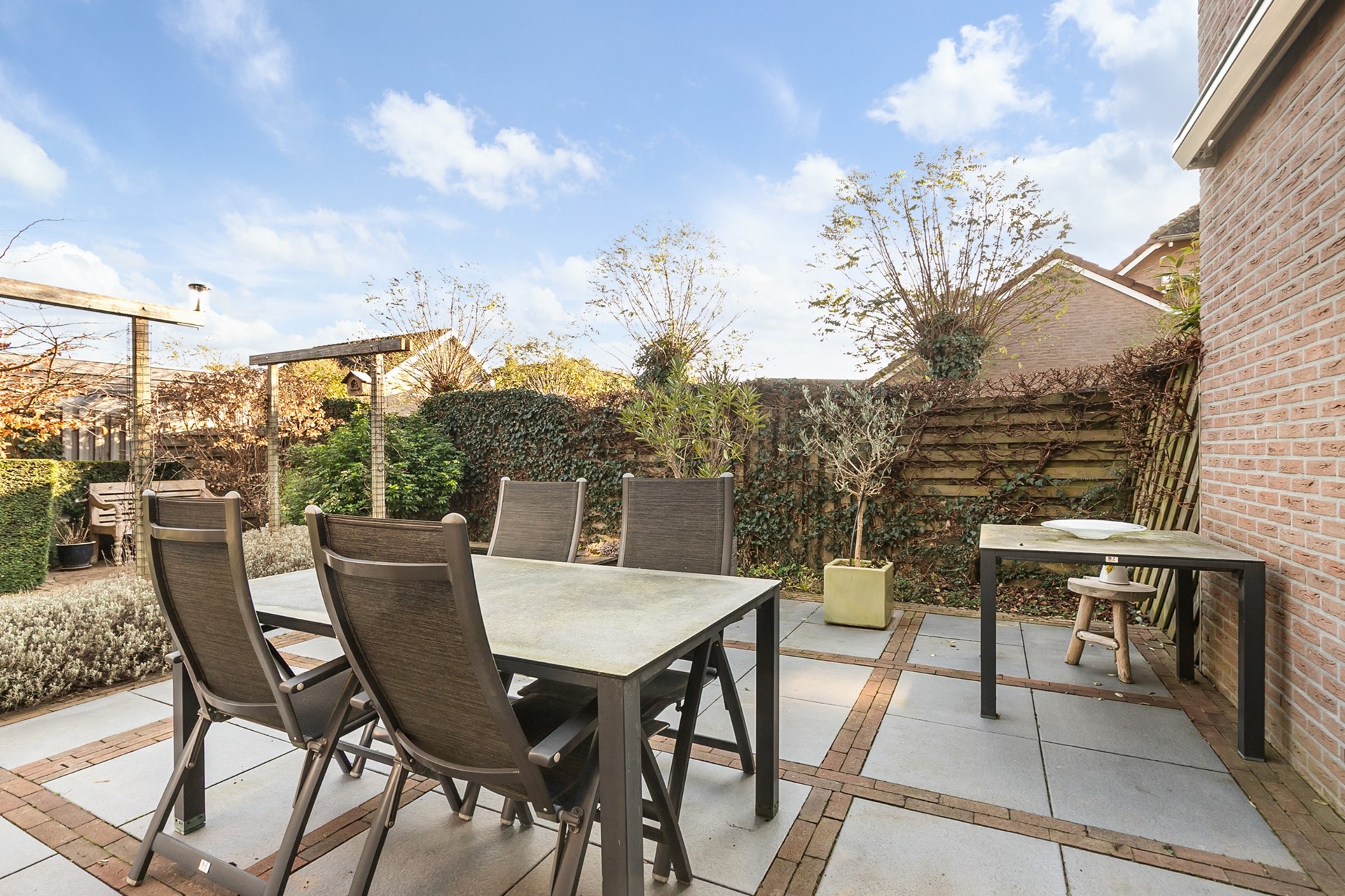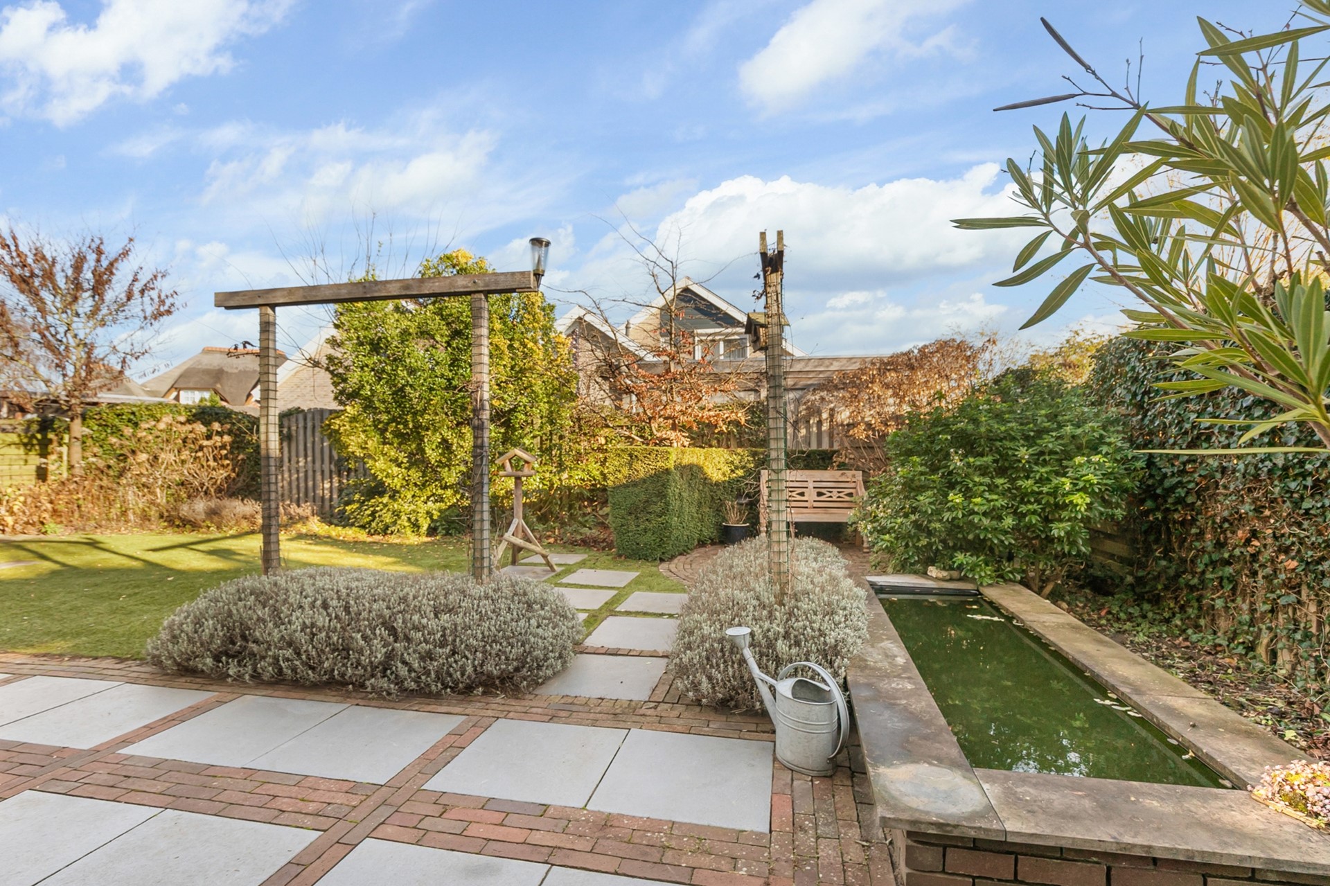 In de onderhoudsvriendelijke tuin is voldoende ruimte voor diverse zitjes, is er een gemetselde vijver en een houthok voor je houtkachel.